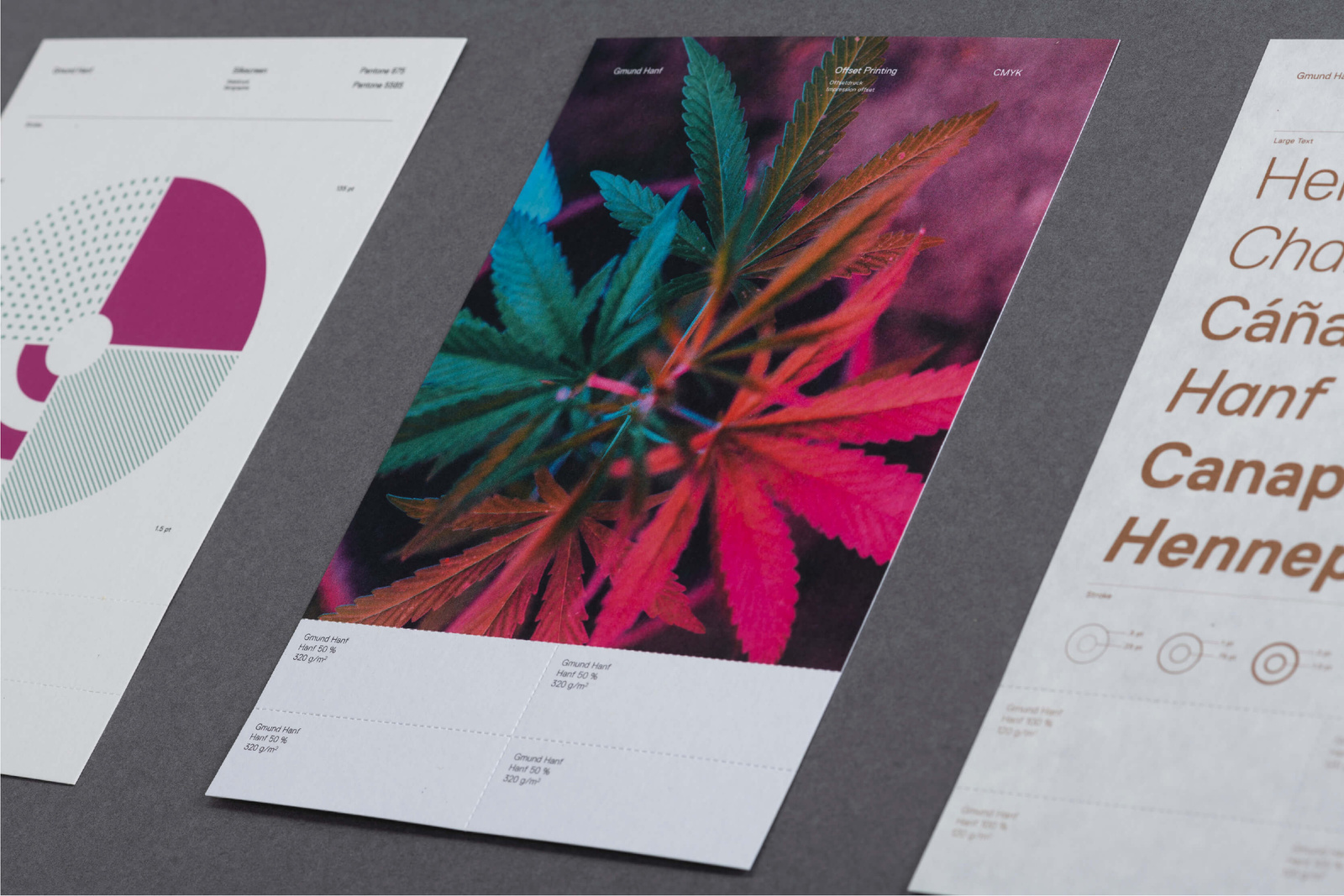 W skład kolekcji oprócz Gmund Hanf 100% wchodzi również papier Gmund Hanf 50%, który zawiera włókna papierowe, pochodzące z recyklingu oraz Gmund Hand 10%, który jest wykonany z czystej masy celulozowej. Wszystkie papiery z kolekcji wyprodukowane są bez udziału barwników.